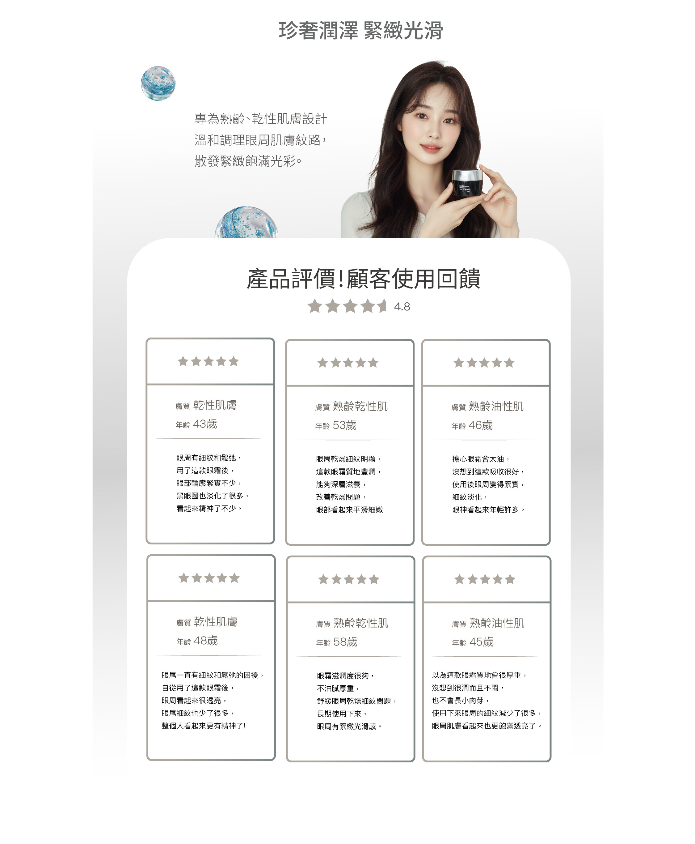 溫柔修護眼周肌膚,調理肌膚紋路,使雙眸散發光彩。